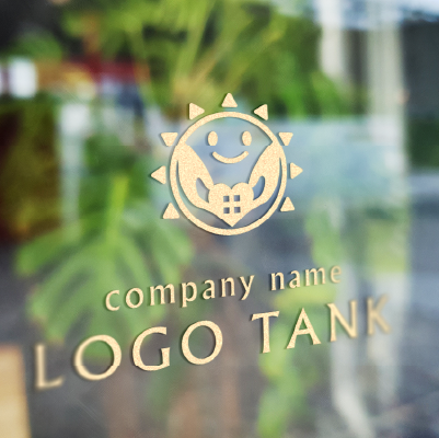ゴム印・スタンプ作成 | 太陽と笑顔、両手のひらにハートの家屋がのったロゴ